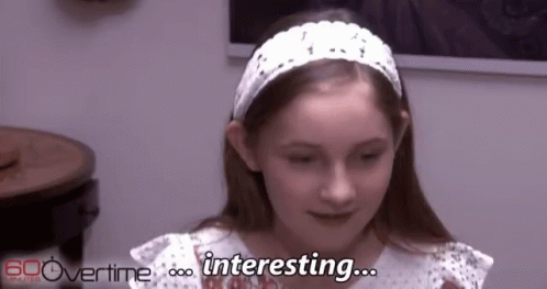 A young girl with a headband reacts with an "interesting" expression, often used in TwoSet Violin memes.