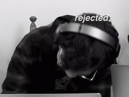Eddy Chen of Twoset Violin in a black and white image with the word 'rejected' overlaid, a popular meme.