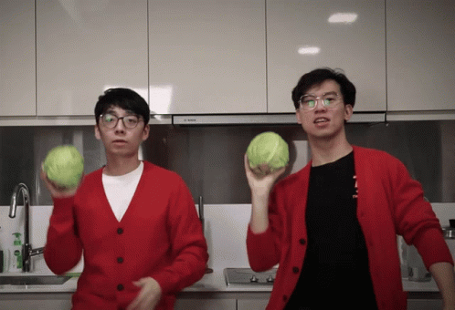 Brett Yang and Eddy Chen from Twoset Violin holding cabbages in red sweaters in a kitchen.