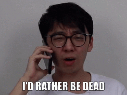 Brett Yang from TwoSet Violin on a phone call, with the meme text 'I'd Rather Be Dead' displayed.