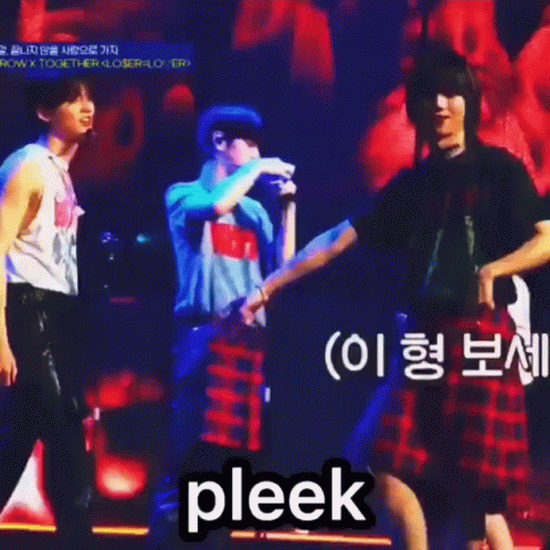 TXT members Beomjun, Yeonjun, and Beomgyu show off their energetic moves on stage, with a fun 'pleek' moment.