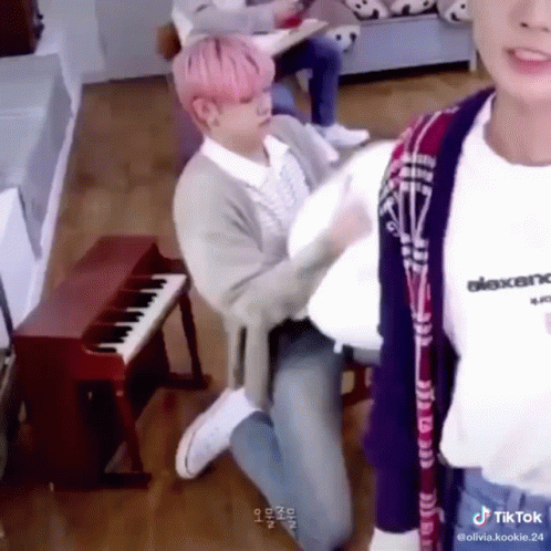 Txt's Yeonjun playfully interacts with a Molang plushie while fellow member Hueningkai is also in the room.