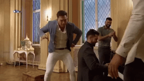 Tyler Cameron, known as Tyler C, dances energetically in a grand room while other men watch and play piano.