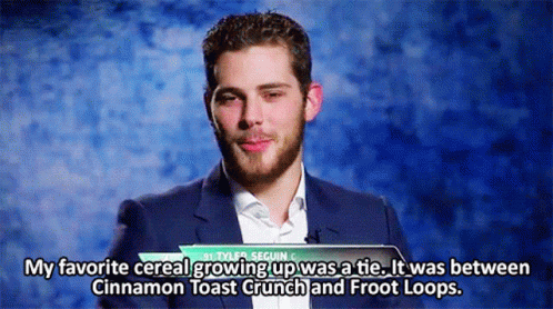 Tyler Seguin, Dallas Stars hockey player, shares his favorite childhood cereals: Cinnamon Toast Crunch and Froot Loops.