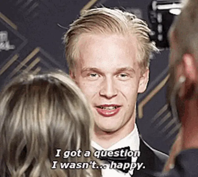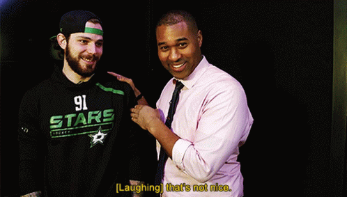 NHL player Tyler Seguin shares a laugh with an interviewer, reacting to a comment with 'That's not nice.'