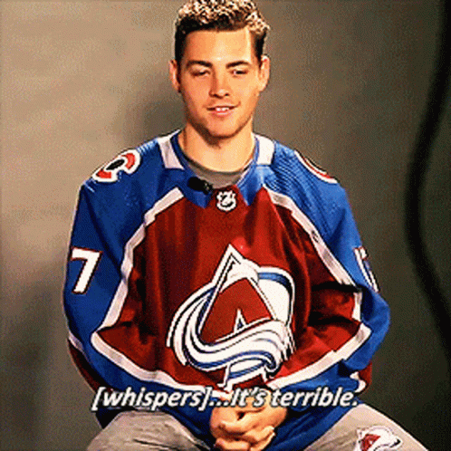 Tyson Jost, wearing a Colorado Avalanche jersey, smiles and whispers 'It's terrible' to the camera.