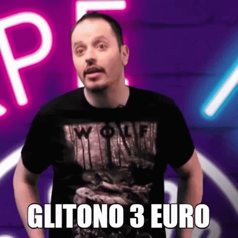 Tzouvelas Tsouvelas, a man in a 'WOLF' shirt, animatedly exclaims 'I saved 3 Euro' in a neon setting.