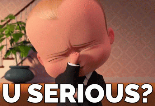 The Bossaby, a baby in a suit, covers his face in disbelief with 'U SERIOUS?' text.