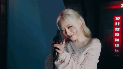 Dreamcatcher's Sua playfully points a toy gun at the camera, smiling in a pink off-shoulder sweater.