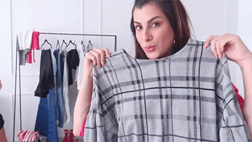 Nah Cardoso holds up a stylish grey and black checkered top, showing it off with a happy 'wow' expression.