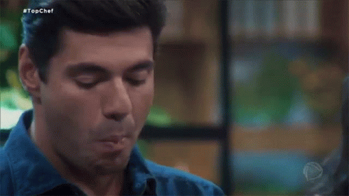 A man's surprised and pleased reaction while tasting food on Top Chef Brasil, a show on Record TV.