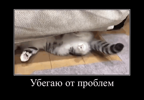 A fluffy cat wiggles and hides under a couch, humorously embodying the meme "Running away from problems." Features Dima and Komaru.