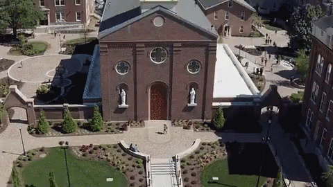 Aerial drone view of the University of Dayton campus, featuring a prominent brick building.