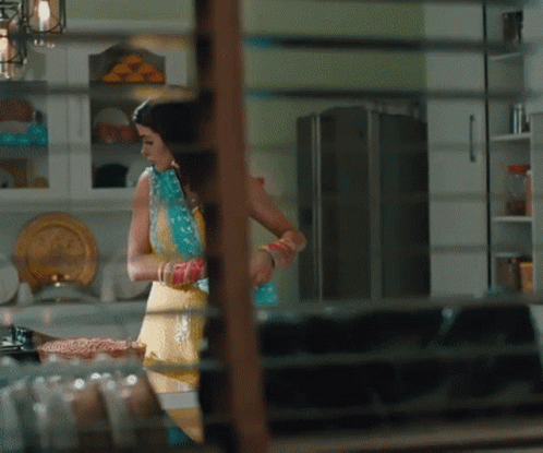 Priyanka Chahar Chaudhary as Tejo Singh Virk, wearing a yellow top and blue dupatta in a kitchen setting.