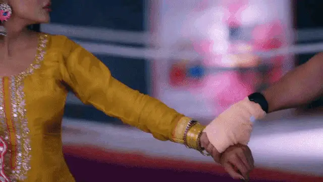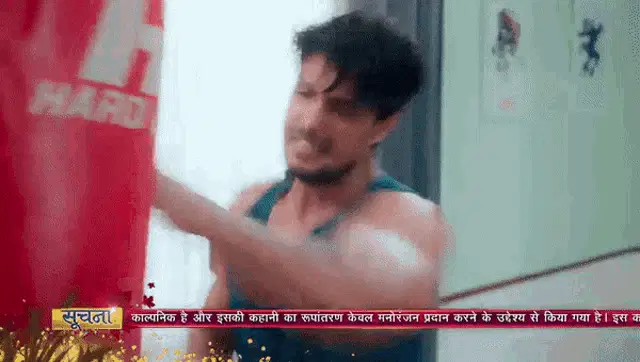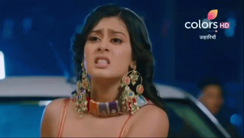 A woman from the show Udaariyaan displays a distressed expression, wearing large earrings and a colorful necklace.