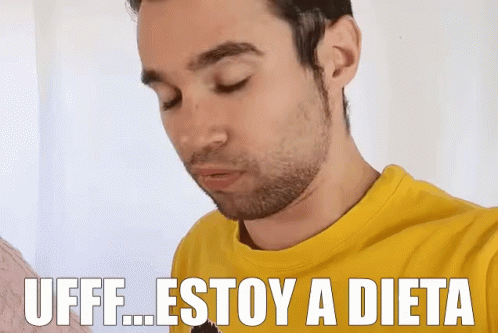 Mayden, in a yellow shirt, expresses frustration about being on a diet, with 'Uff... Estoy A Dieta' text.
