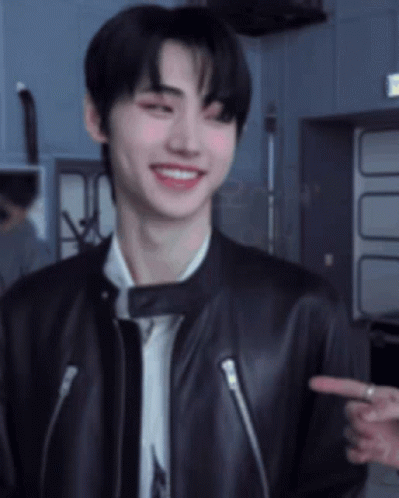 A young man with black hair, wearing a black leather jacket, smiles broadly, showing dimples.