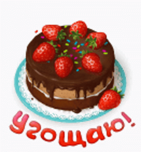 Delicious chocolate cake topped with fresh strawberries and colorful sprinkles, presented on a decorative plate.