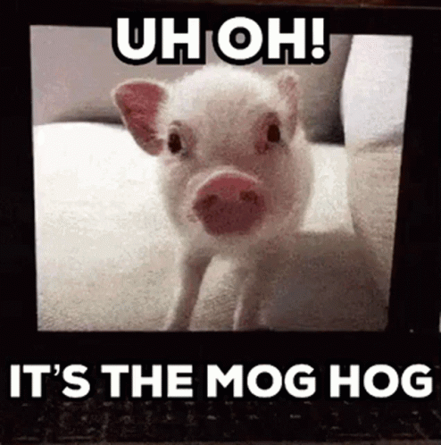 A cute pig's face appears on a laptop screen with the text "Uh Oh! It's the Mog Hog!".