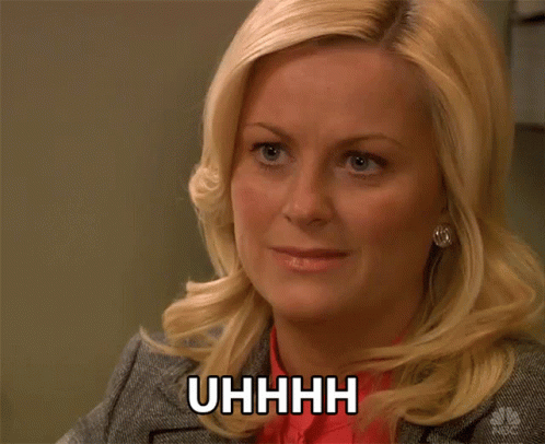 Amy Poehler as Leslie Knope makes an 'uhhh' face, shaking her head in an awkward, hesitant reaction.
