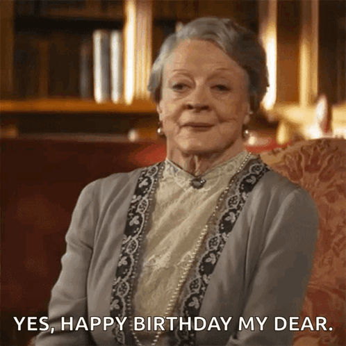 Violet Crawley, portrayed by Maggie Smith, delivers a warm 'Happy Birthday' message in a classic scene.