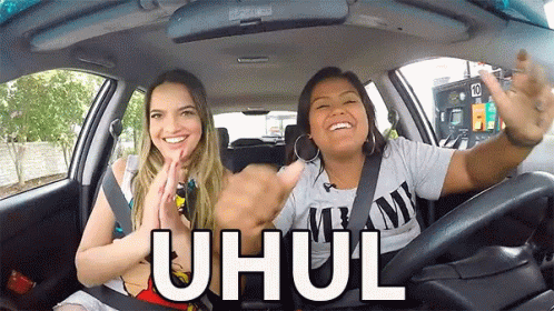 Camila Loures and a friend celebrating excitedly and clapping inside a car, exclaiming 'Uhul!'.
