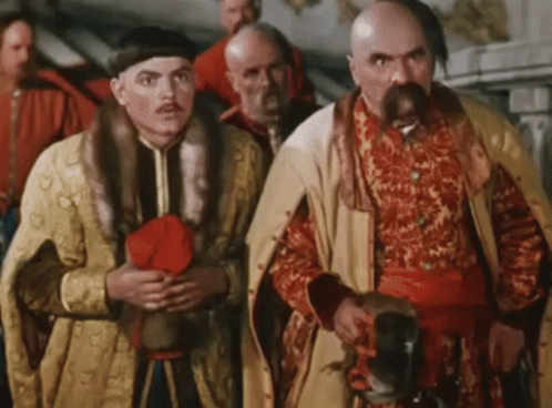 Men in vibrant traditional Ukrainian costumes enter a room and perform a deep, respectful bow.