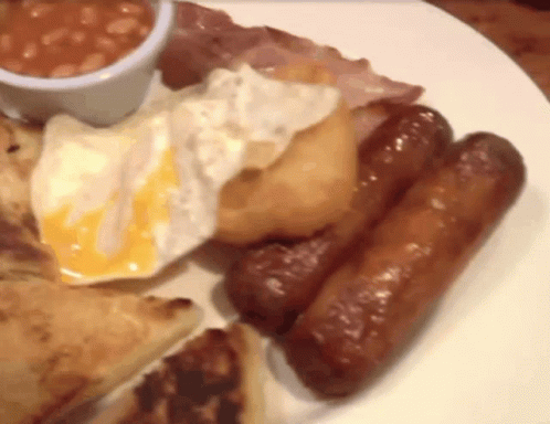 A close-up of a traditional Ulster Fry breakfast featuring sausages, eggs, bacon, beans, and fried bread.