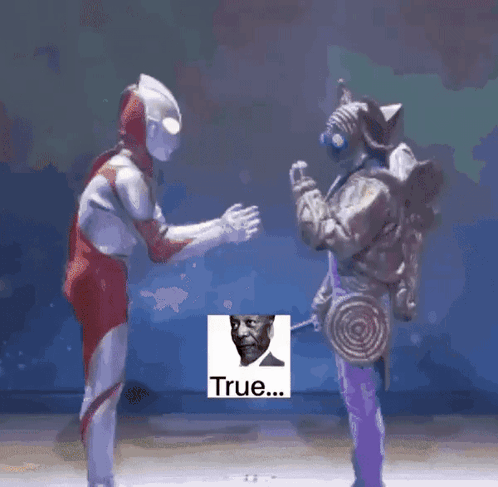 Ultraman and Alien Barossa face off, followed by a 'True...' meme and a 'Truth Nuke' explosion.