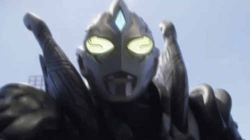 Ultraman Trigger's face during his Henshin transformation, with his eyes glowing brightly.