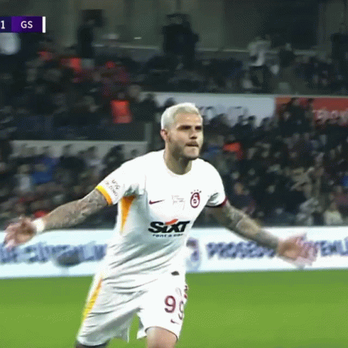 Mauro Icardi celebrates a goal for Galatasaray, showing his iconic celebration with a teammate.