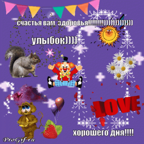 A vibrant purple animated greeting with a clown, squirrel, sun, and flowers wishing happiness, health, and a good day.