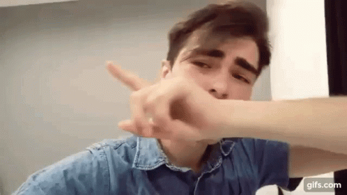 Ulysse makes a playful hand gesture while wearing a denim shirt.