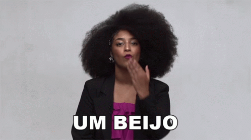 Joicy Eleiny, a woman with a large afro, blows a kiss to the camera, with 'UM BEIJO' displayed.
