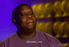 A man in a purple shirt reacts with a dismissive "Ummm... no." expression, closing his eyes briefly.