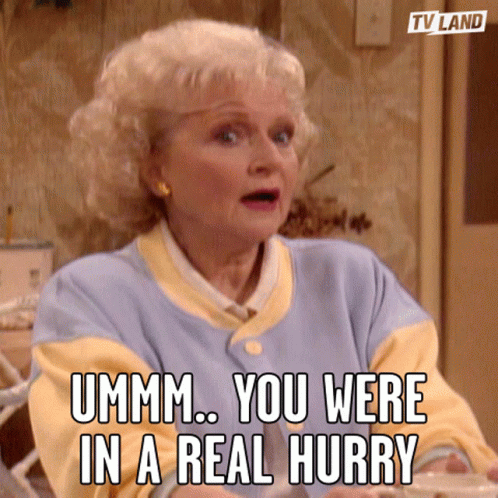 Rose Nylund, played by Betty White, delivers the line 'Ummm.. you were in a real hurry' with a surprised expression.