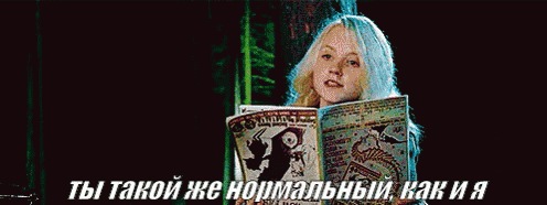 Luna Lovegood from Harry Potter holding a magazine with Russian text: 'You are just as normal as'.