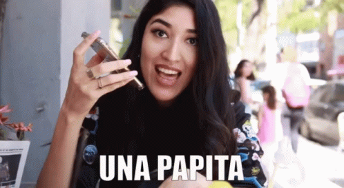 Yoana Marlen talks on the phone and enjoys a large french fry, with 'UNA PAPITA' text overlay.