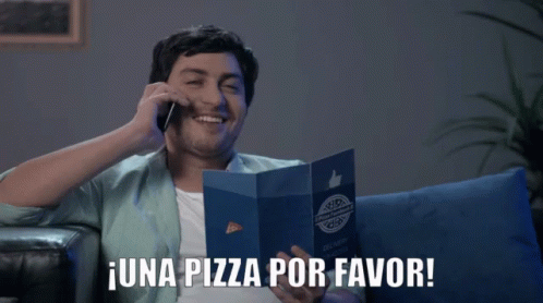 A man happily calls to order pizza, holding a menu and saying '¡Una Pizza Por Favor!' on the phone.