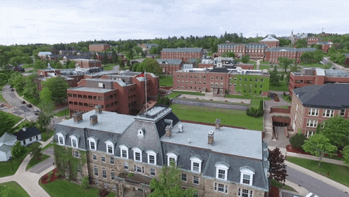 Aerial view of the University of New Brunswick (UNB) Fredericton campus, showcasing its historic buildings.