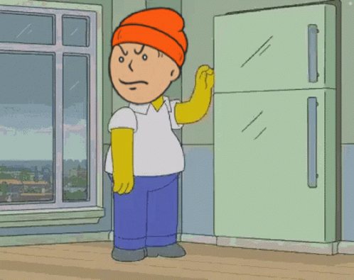 An uncanny cartoon character resembling Homer Simpson stands by a bed, then lies down to sleep.