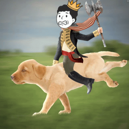A cartoon man wearing a crown and an American flag cape rides a golden retriever dog across a grassy field.