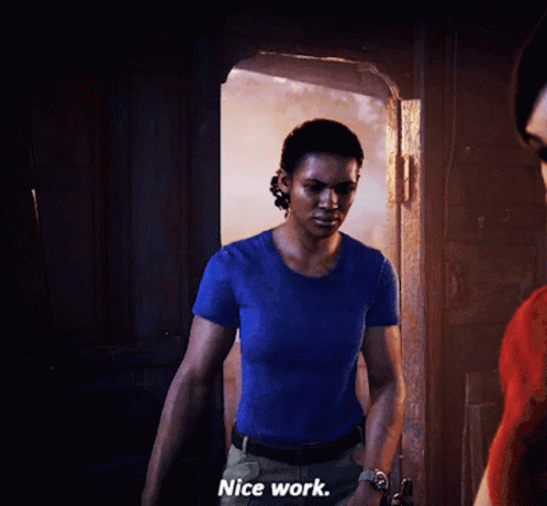 Nadine Ross from Uncharted: The Lost Legacy delivers a confident 'Nice work.'