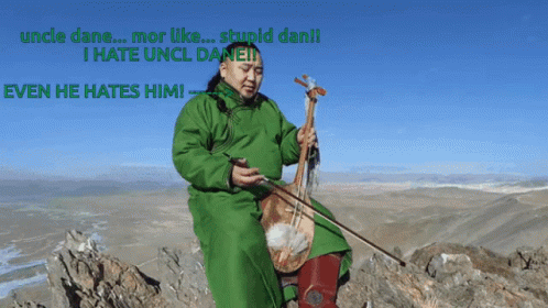 A man playing a traditional Mongolian instrument on a mountain, with text criticizing 'Uncle Dane'.