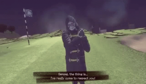 Uncle Death, a skeleton character, expresses his newfound respect for Senpai on a golf course.