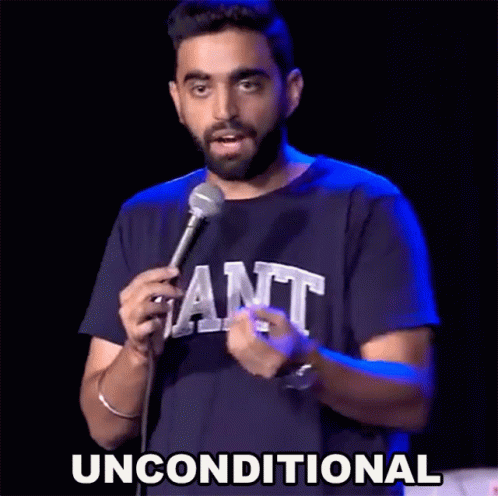 Comedian Rahul Dua performs stand-up, emphasizing the word 'unconditional' on stage in his act.