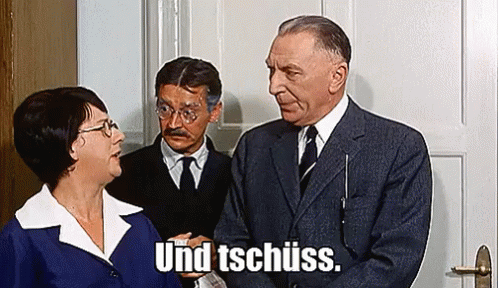German actor Theo Lingen says 'Und tschüss' and exits, leaving another man looking sad.
