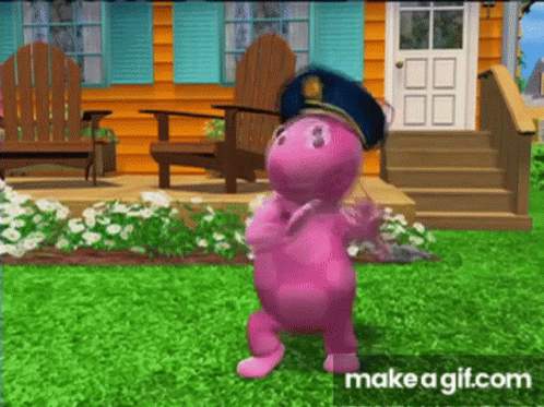 Uniqua from The Backyardigans, wearing a police hat, dances in front of a house.