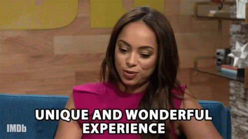 Amber Stevens West discusses a unique and wonderful experience while sitting on a blue couch during an interview.