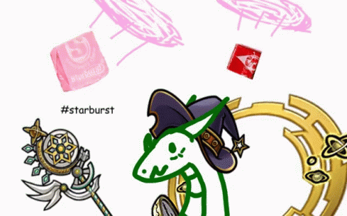 A drawing of a green dragon-like creature wearing a wizard hat, with fantasy elements and Starburst candy.